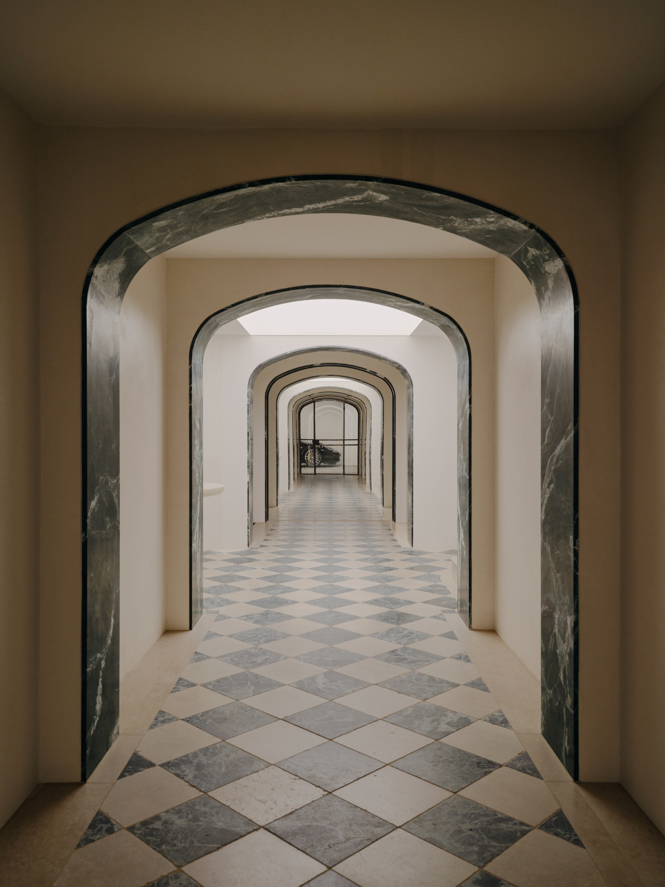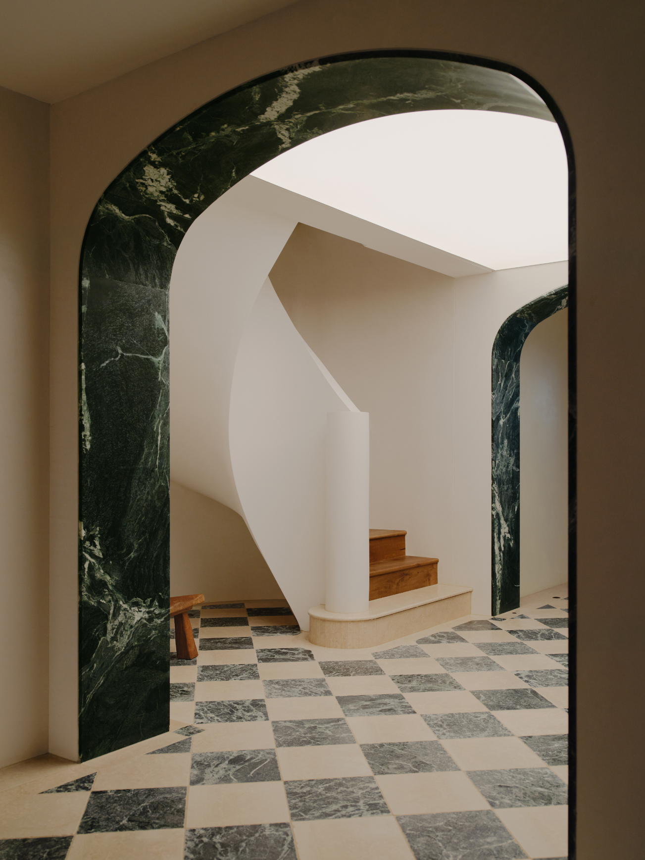 At the lowest level, a stone-clad gallery leads to an underground pool reminiscent of a Roman bath. Soft arches, pale-green marble and limestone chequered floors create a timeless atmosphere, with each piece precisely stencilled, cut and numbered in Italy.